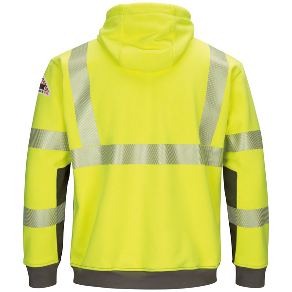 This color block hooded sweatshirt features updated styling to keep you warm when the days turn chilly. This FR hi-visibility pullover is made for warmth, comfort, and work. It features iQ Series® Endurance rip stop twill reinforcement on interiors of sleeves to increase durability. The sweatshirt is waffle lined for extra warmth, has a large hand pocket and a 3-piece hood with drawstring closure. This will quickly become your go-to sweatshirt for warmth and protection.